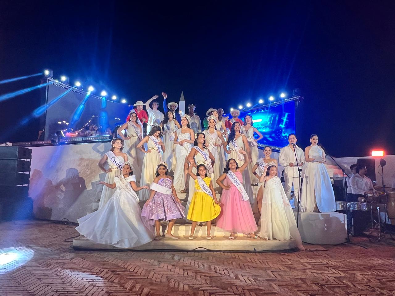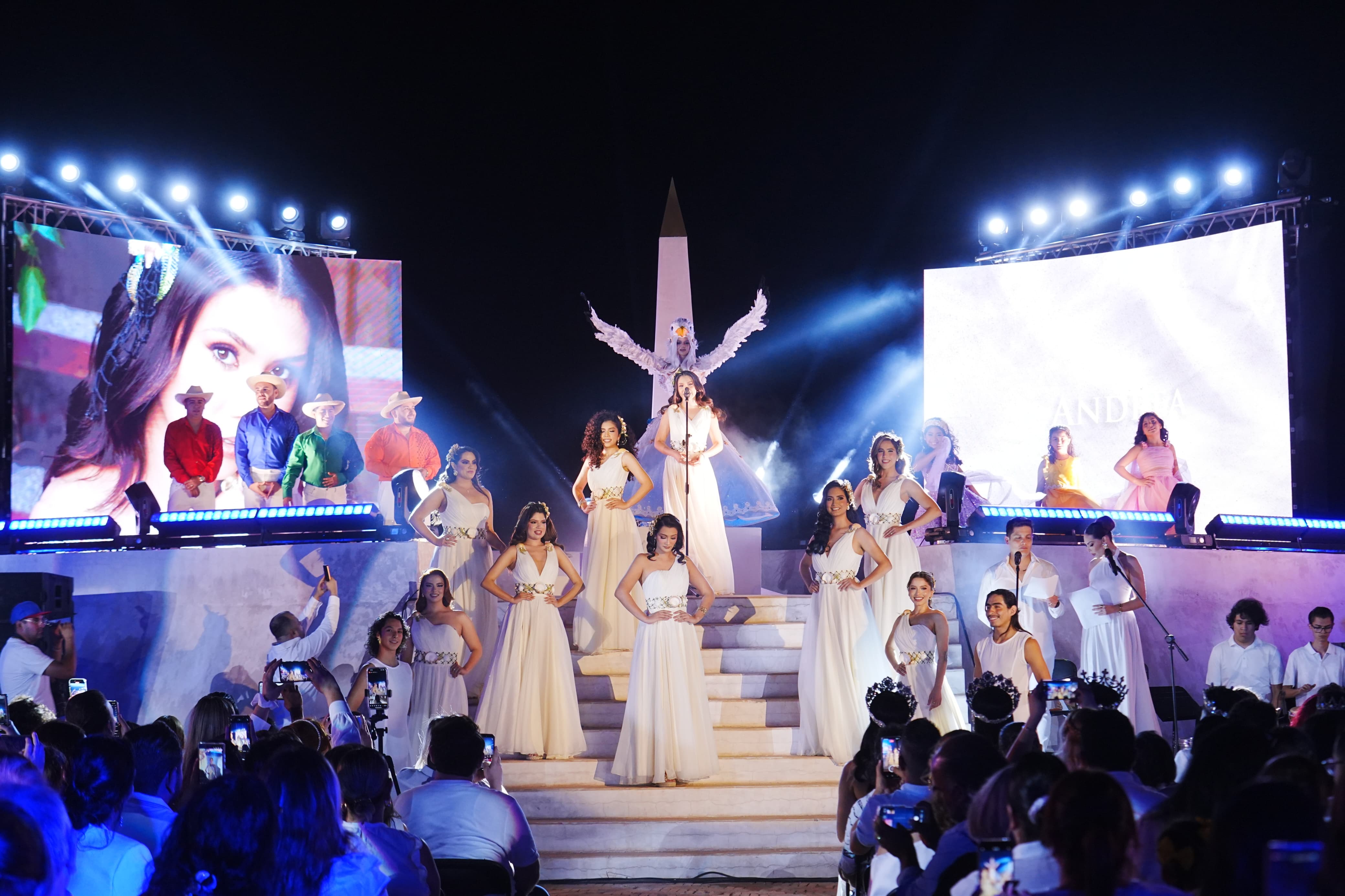 Aspirantes a Reinas del Carnaval y Juegos Florales: El momento más esperado de la noche culminó con la entrada de las nueve candidatas a la máxima corona: Joanna, Monserrat, Marbella M., Marbella R., Anahí, Karely, Mariana, Danya y Andrea. Cada una apareció con porte, elegancia y confianza.
