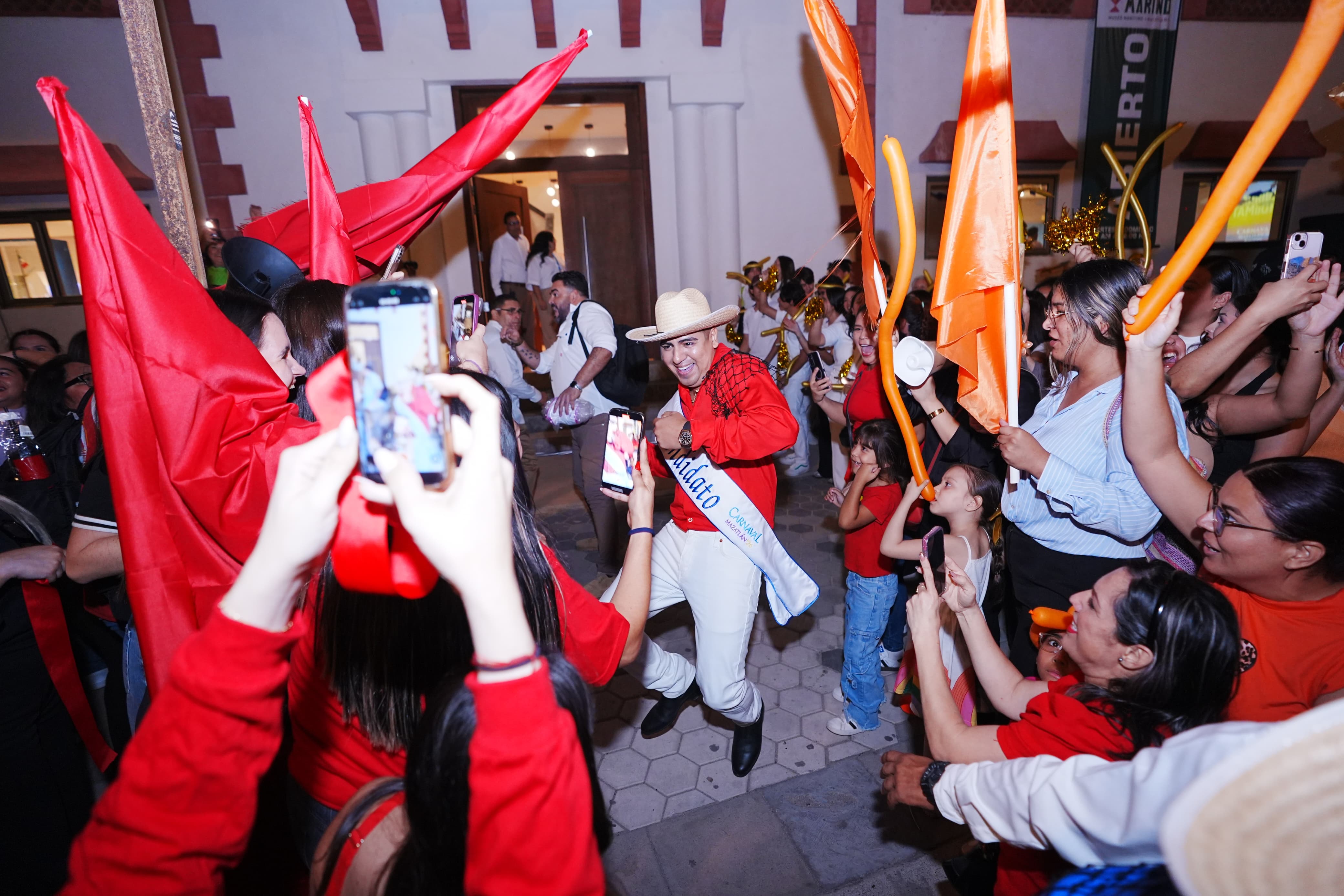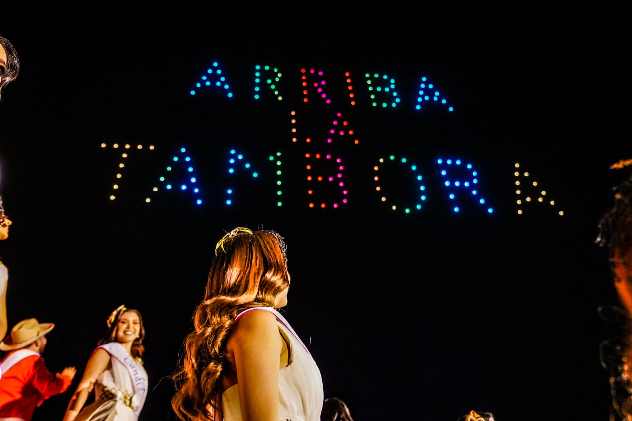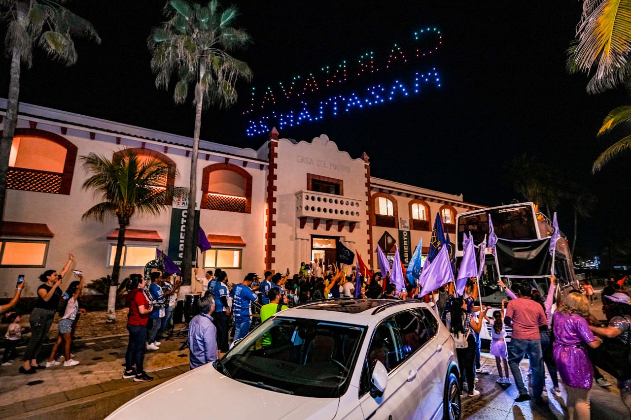 Mientras los candidatos subían al turibús para el primer recorrido celebratorio (del Museo Casa del Marino hacia El Escudo en Olas Altas y hasta Valentinos), un espectáculo de drones colocaba en el aire los nombres de todos los aspirantes junto al lema oficial del Carnaval Internacional Mazatlán 2026, ¡Arriba la Tambora!