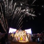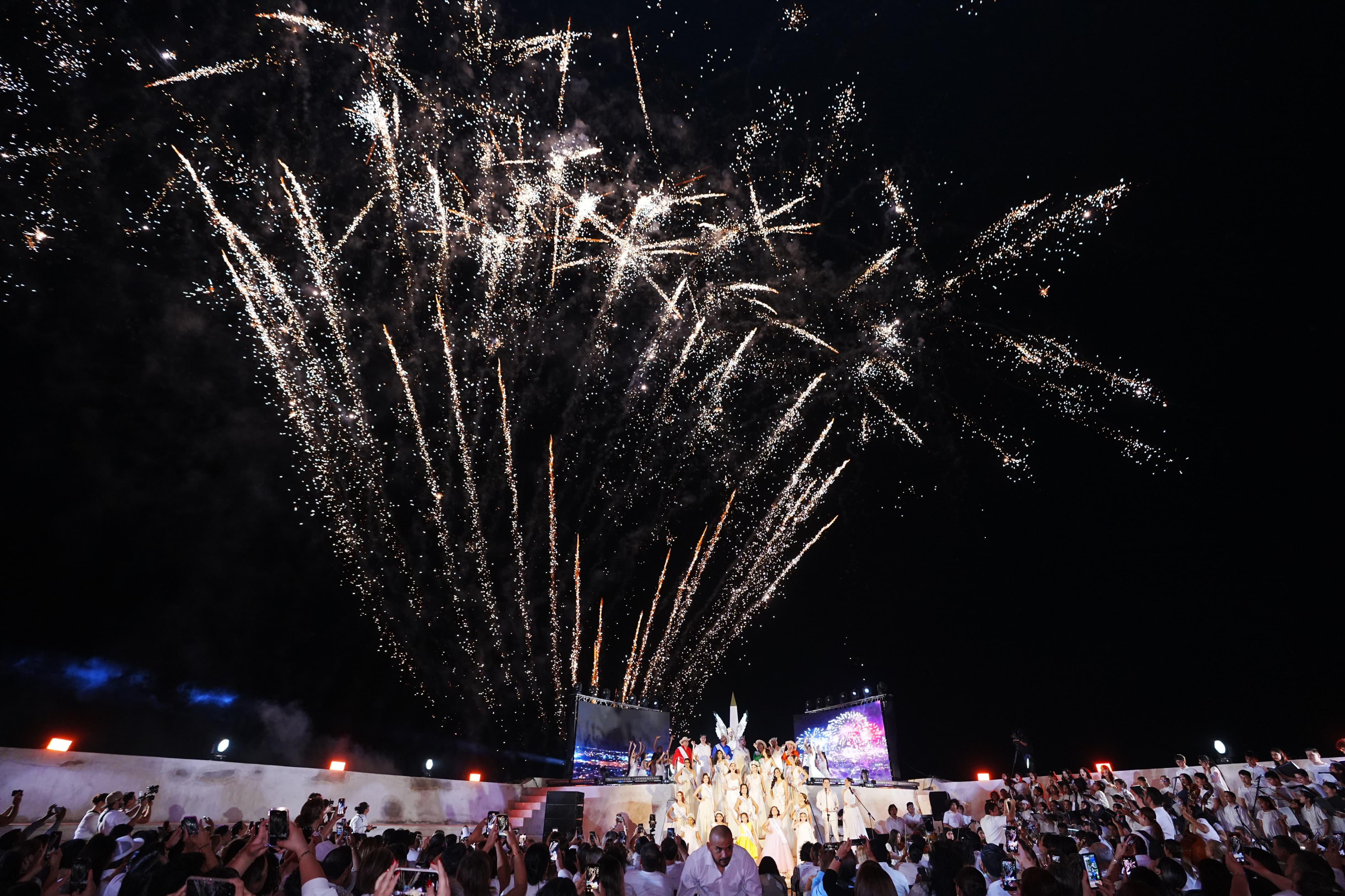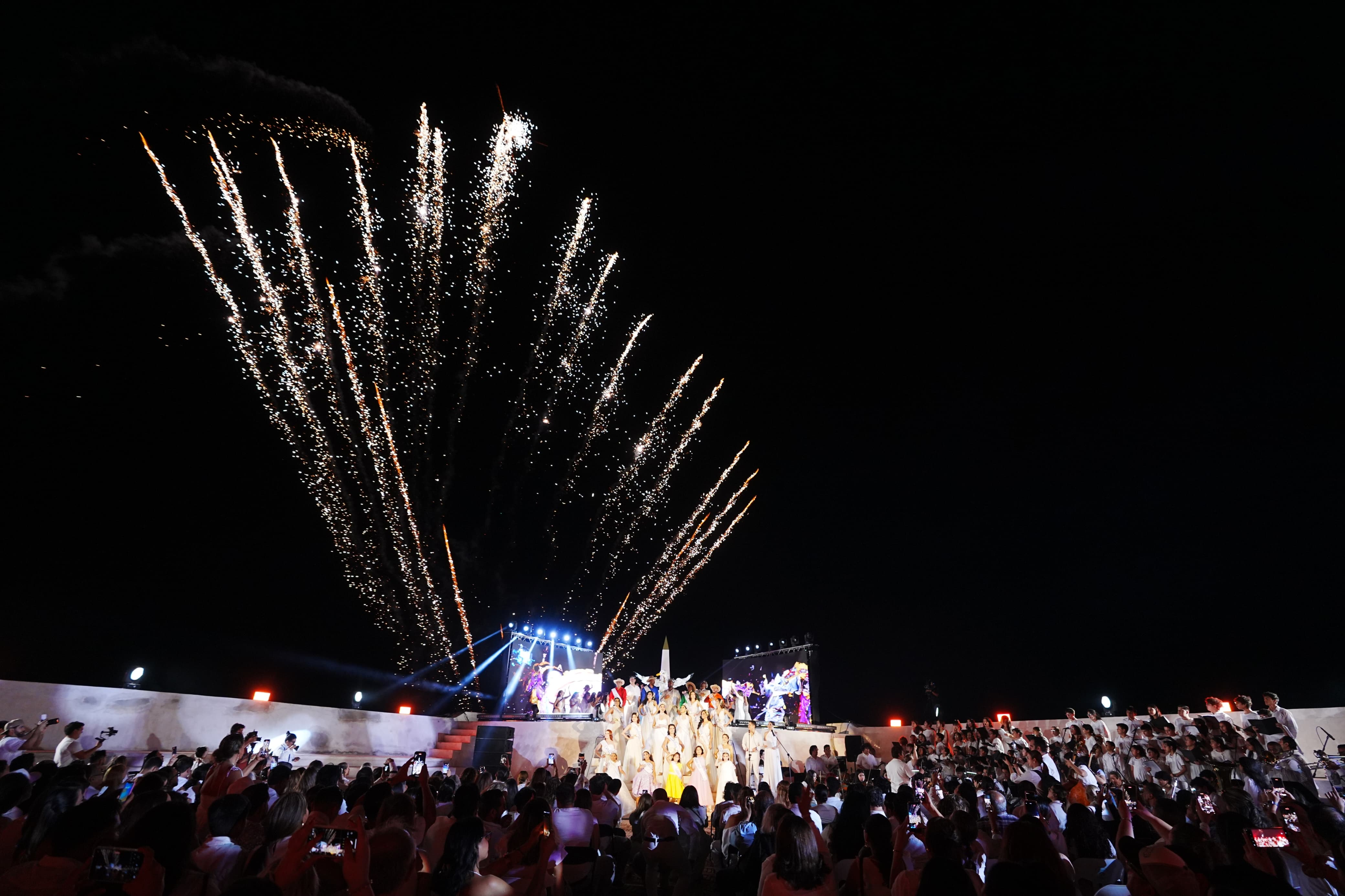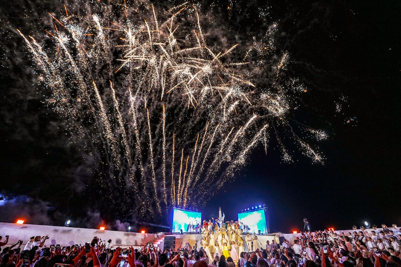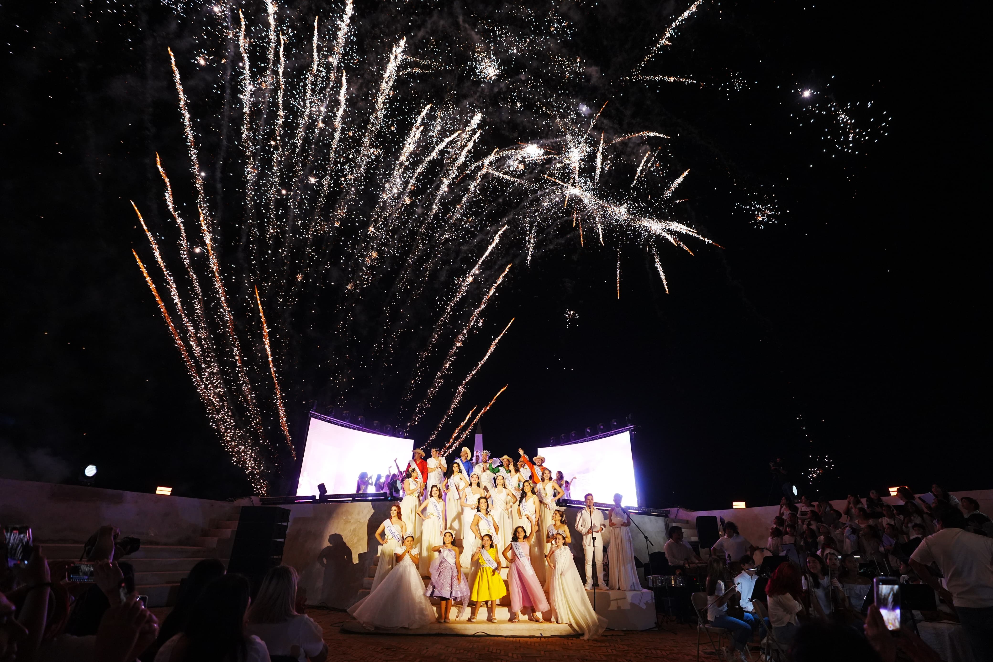 Con ese llamado poderoso, la pantalla se desvaneció y el ambiente se llenó de celebración. Paco Vazga y Corina Beltrán, maestros de ceremonia, dieron la bienvenida, marcando el inicio formal de la noche ante la multitud que respondió con aplausos que parecían mezclarse con el viento marino.