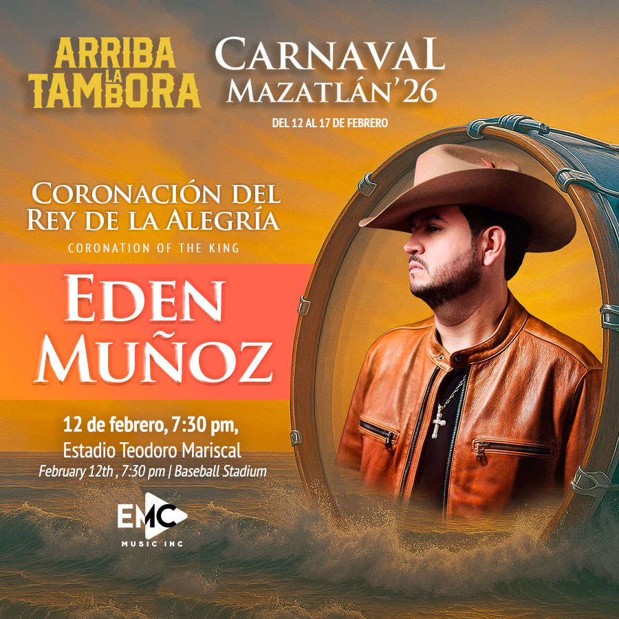 Para cantarle al Rey de la Alegría del Carnaval Internacional de Mazatlán llega Edén Muñoz. Uno de los artistas más influyentes del regional mexicano contemporáneo. Originario de Los Mochis, Sinaloa, Edén Muñoz ha dejado una marca imborrable en la música gracias a su talento como compositor, productor e intérprete. Éxitos como “Chalé”, “Mi Primer Día Sin Ti”, “A la Antigüita”, “Como en los Viejos Tiempos” “La Nena” sus más recientes temas de su producción “Piedras a la Luna” lo consolidan como una de las voces más poderosas y queridas de México. Su capacidad para conectar a través de letras sinceras y fusiones frescas lo han convertido en referente del género.