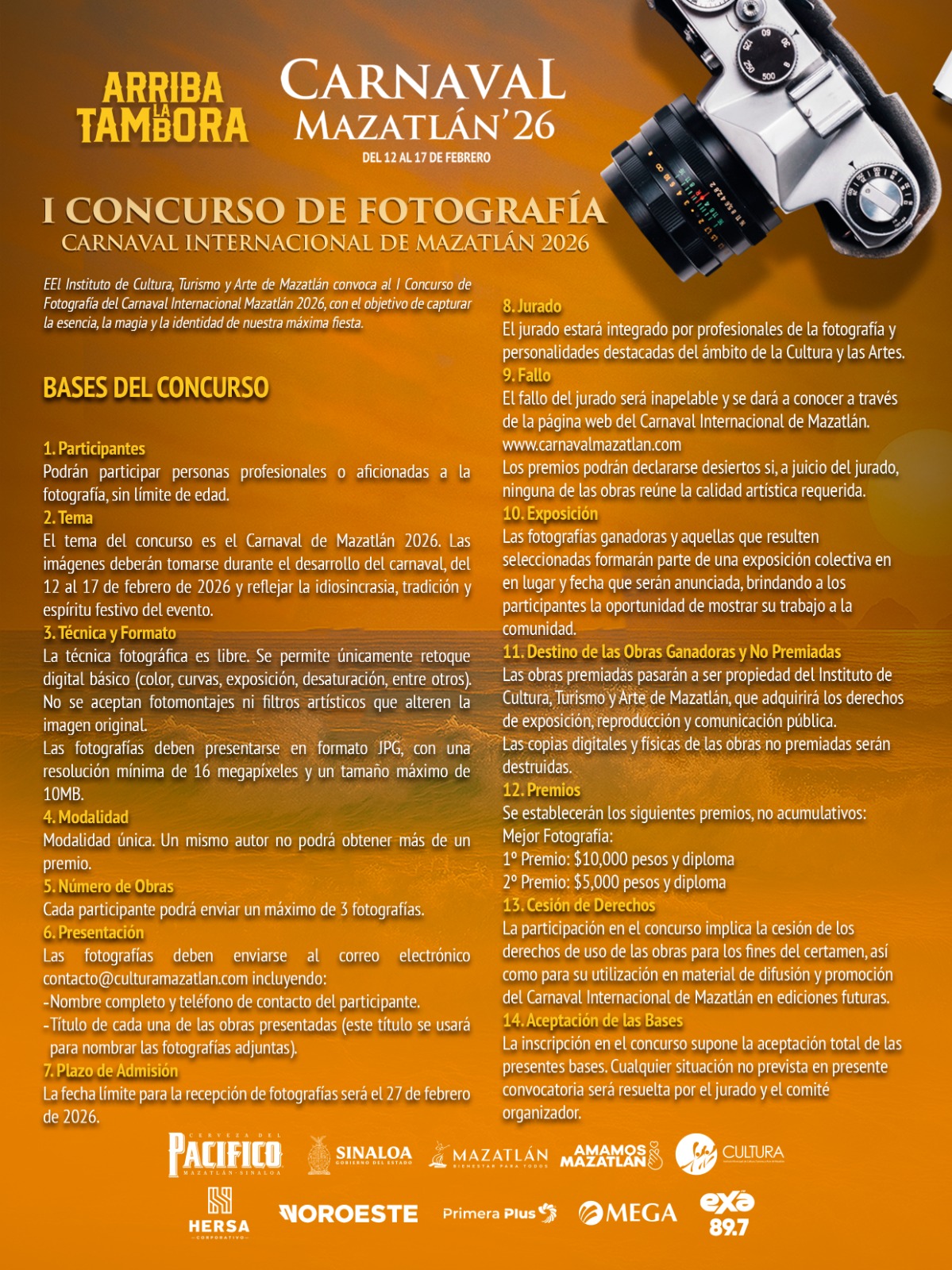 Esta convocatoria, impulsada por el Instituto de Cultura, Turismo y Arte de Mazatlán y coordinada por el fotógrafo y artista visual Iván Lizárraga, invita a personas profesionales y aficionadas a la fotografía, sin límite de edad, a capturar la esencia, la magia y la identidad del Carnaval más alegre del Pacífico mexicano.