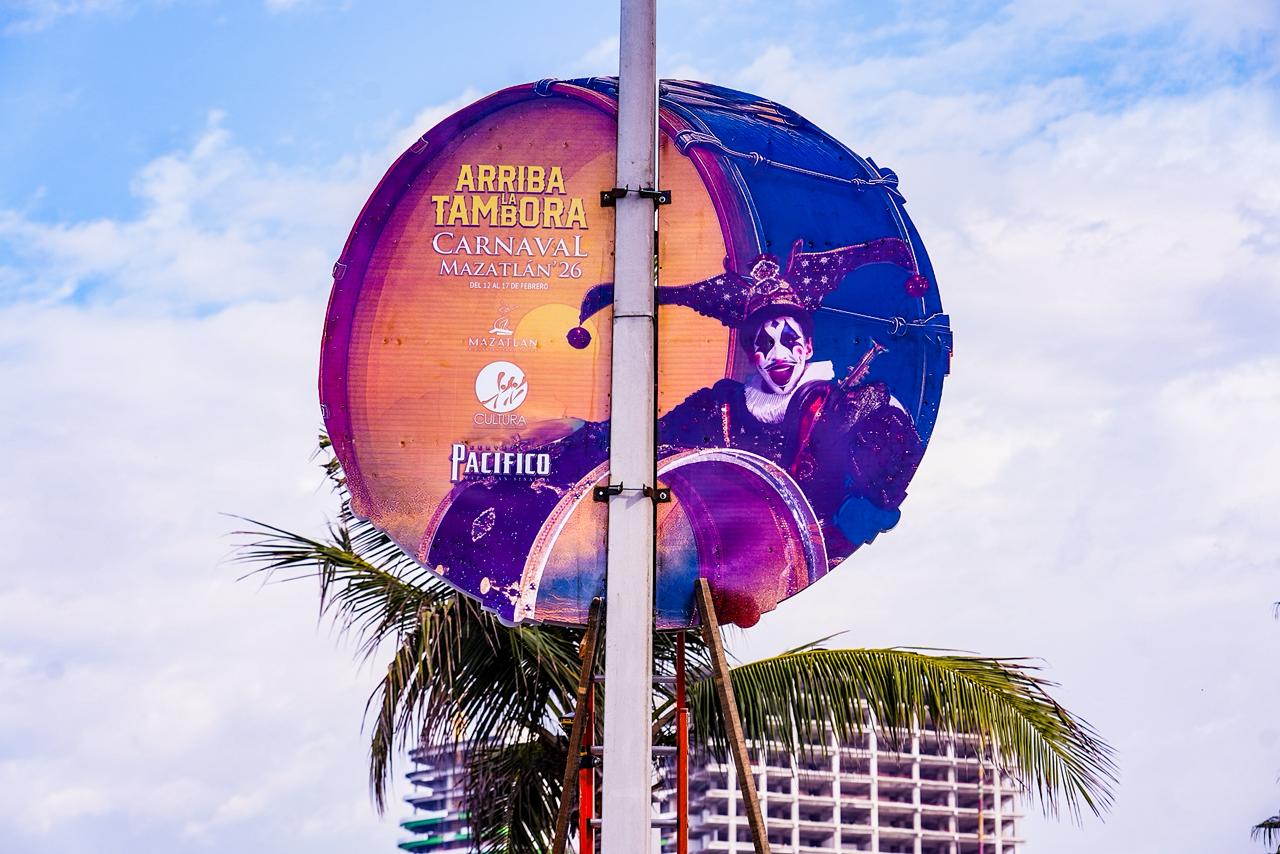 El malecón de Mazatlán ha comenzado a contar una historia antes de que la primera nota de la tambora estalle en el aire. Bajo un cielo de nubes cargadas de agua, los nuevos pendones del Carnaval Internacional Mazatlán 2026: “Arriba la Tambora” ya ocupan su lugar en el paisaje urbano. La imagen del arlequín, con su maquillaje impecable y mirada festiva, emerge desde el color púrpura y el oro de los carteles, vigilando el andar de los locales y turistas como un guardián de la alegría que está por venir.