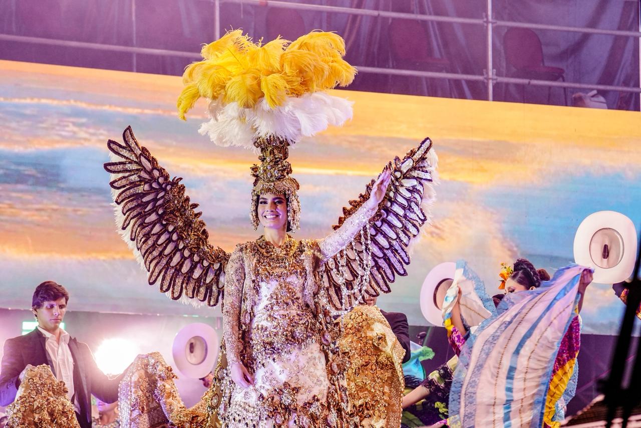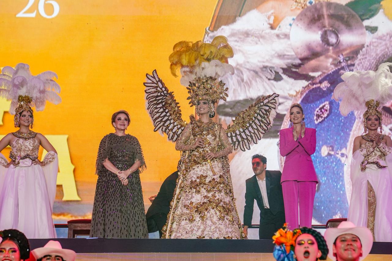 El momento culminante llegó con el recibimiento y coronación de Su Majestad Anahí I, Reina del Carnaval Internacional Mazatlán 2026 “Arriba la Tambora”. A su arribo, sorprendió al público con su belleza y su espectacular vestuario real diseñado por Luis Antonio Ríos.