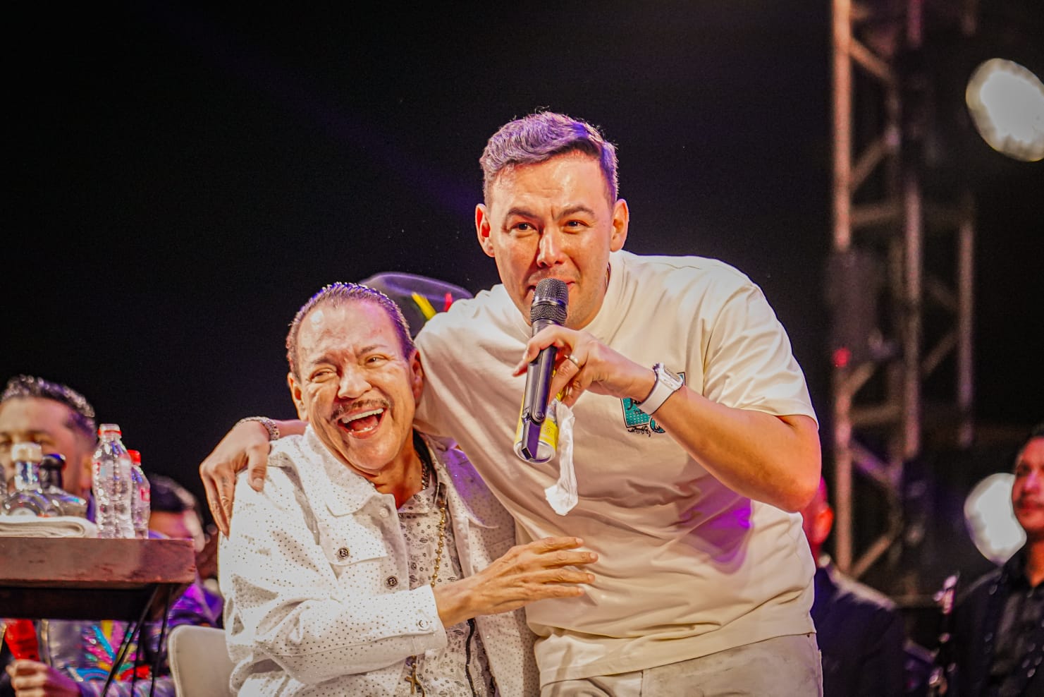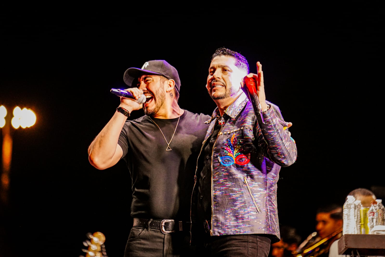 “El Gigante de la Banda” puso a cantar al público con clásicos como: “Mi gusto es”, “Leña de Pirul”, “El Palomito”, y “Un rinconcito en el cielo”, para después junto a “El Flaco” interpretar “Soy de Mazatlán”, causando euforia entre los presentes.