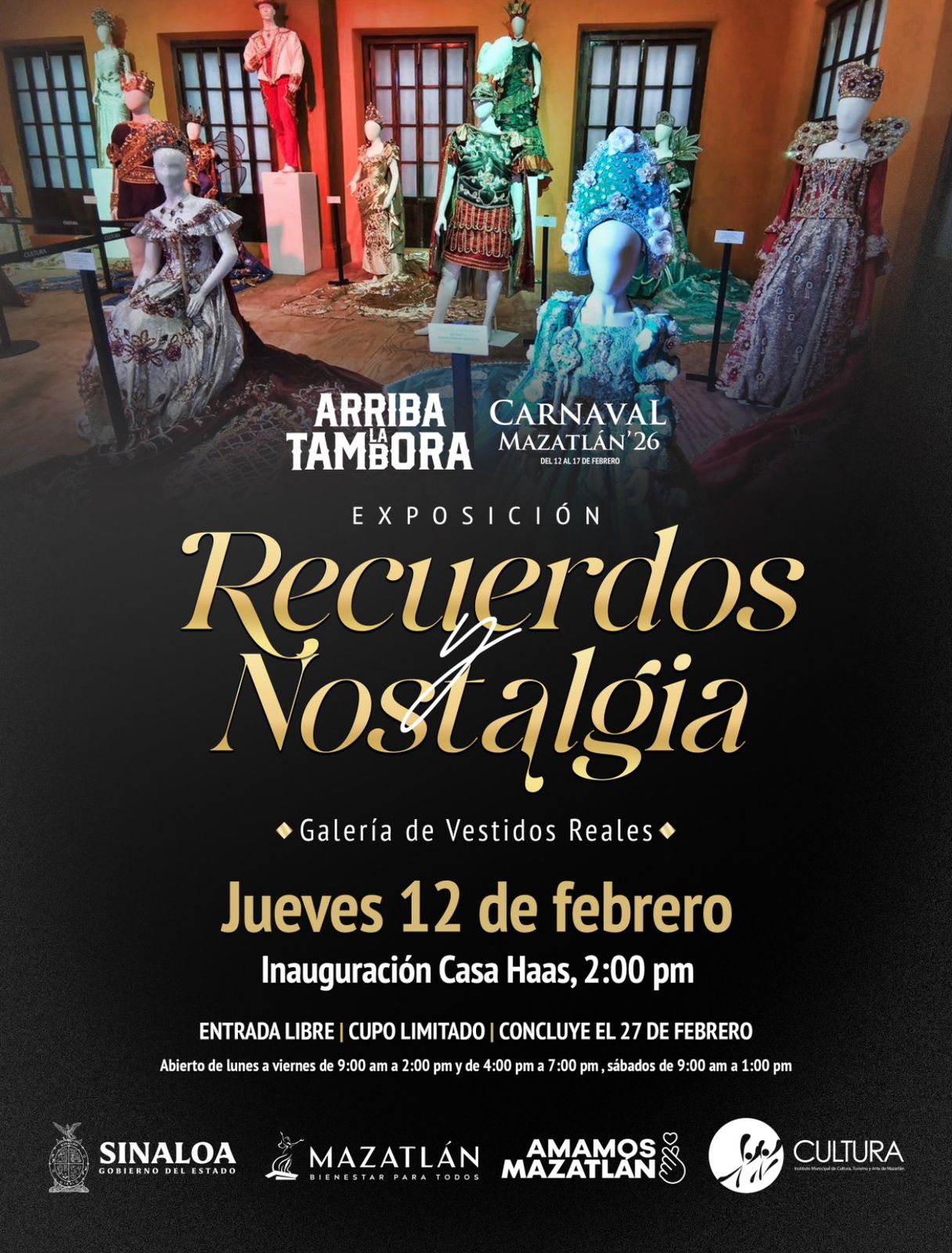 En el marco de los 128 años de tradición de nuestra máxima fiesta, el Instituto Municipal de Cultura, Turismo y Arte de Mazatlán invita al público a la inauguración de la exposición de vestuario real “Recuerdos y Nostalgia”. La cita es el jueves 12 de febrero a las 14:00 horas en Casa Haas. Acceso gratuito. La exposición permanecerá abierta al público hasta el 27 de febrero.